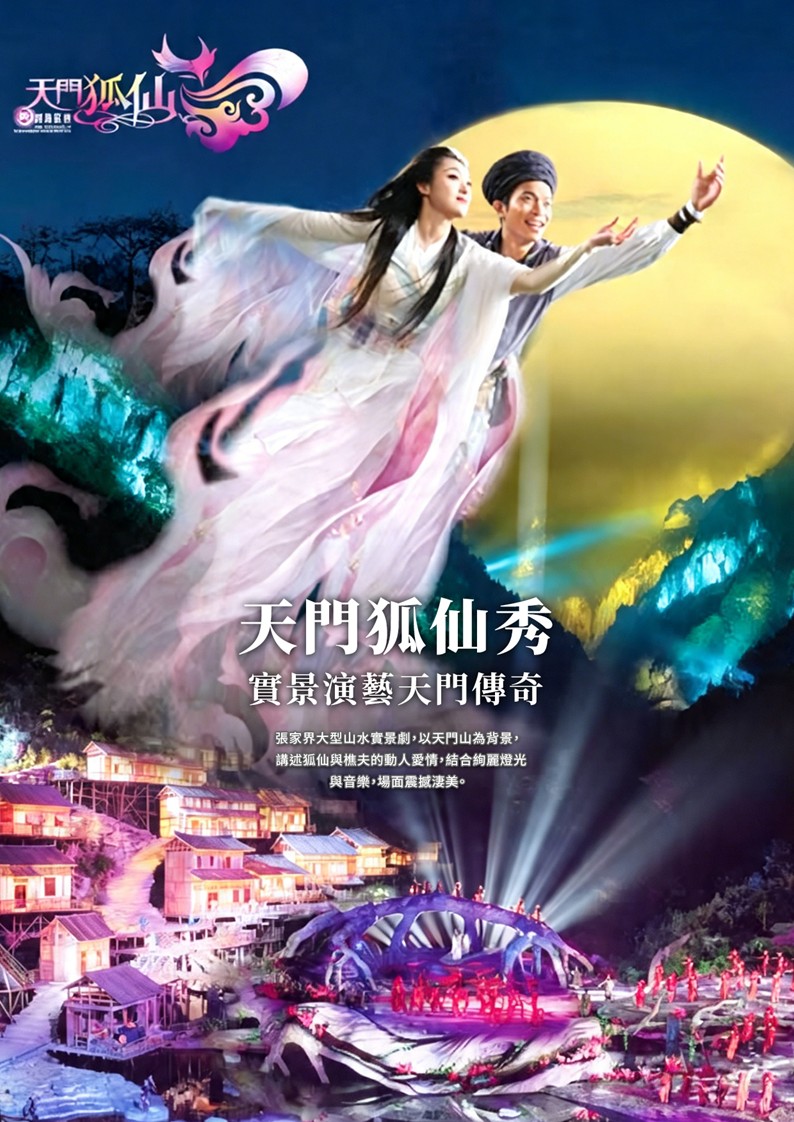 「天門狐仙秀」是位於天門山的大型實景山水演出,以壯麗山體為天然舞台,結合燈光、音樂與舞蹈,呈現一段淒美動人的愛情故事。演出以「狐仙與樵夫」的傳說為主軸,融合湘西民俗文化與現代舞台技術,營造出奇幻又浪漫的視覺效果。整場表演在戶外山谷中進行,夜幕降臨後,山巒、霧氣與燈光交織,氣氛震撼而沉浸,彷彿置身電影場景。演員人數眾多,場面宏大,搭配音效與投影技術,讓故事更加生動立體。